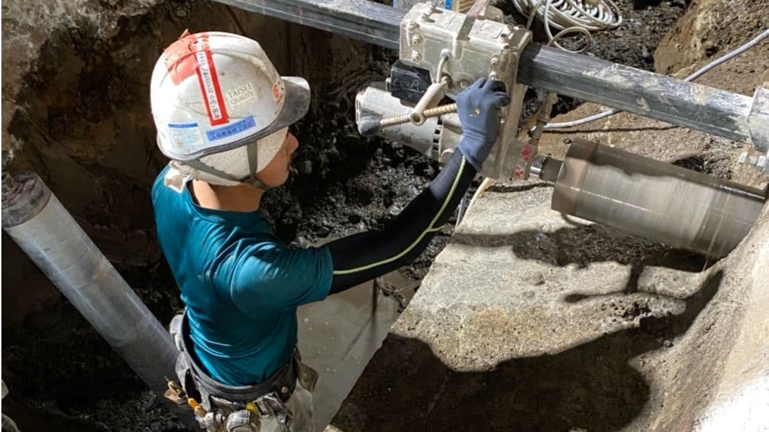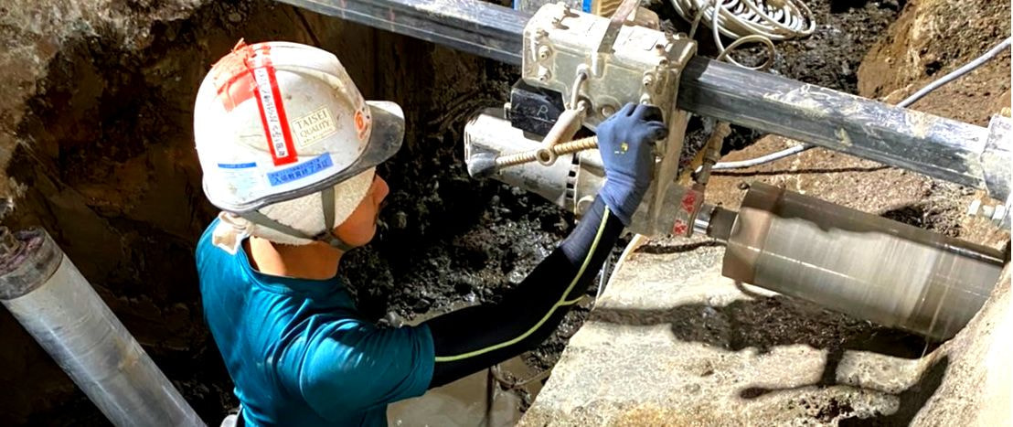 刃先にダイヤモンド粒子を埋め込んだコアビットを高速で回転させ、ダイヤモンドの切削力を利用してコンクリートや路面を穿孔する工法です。 縦・横・斜め・上向きなど、自在な穴開け作業が可能です。 また、低騒音・無振動で騒音やホコリを最大限に抑えることができます。 鉄筋・鉄骨などでも短時間で正確に作業が可能です。削孔系は28Φから800Φまで削孔可能。深さも10mでも20mでも削孔することは可能です。